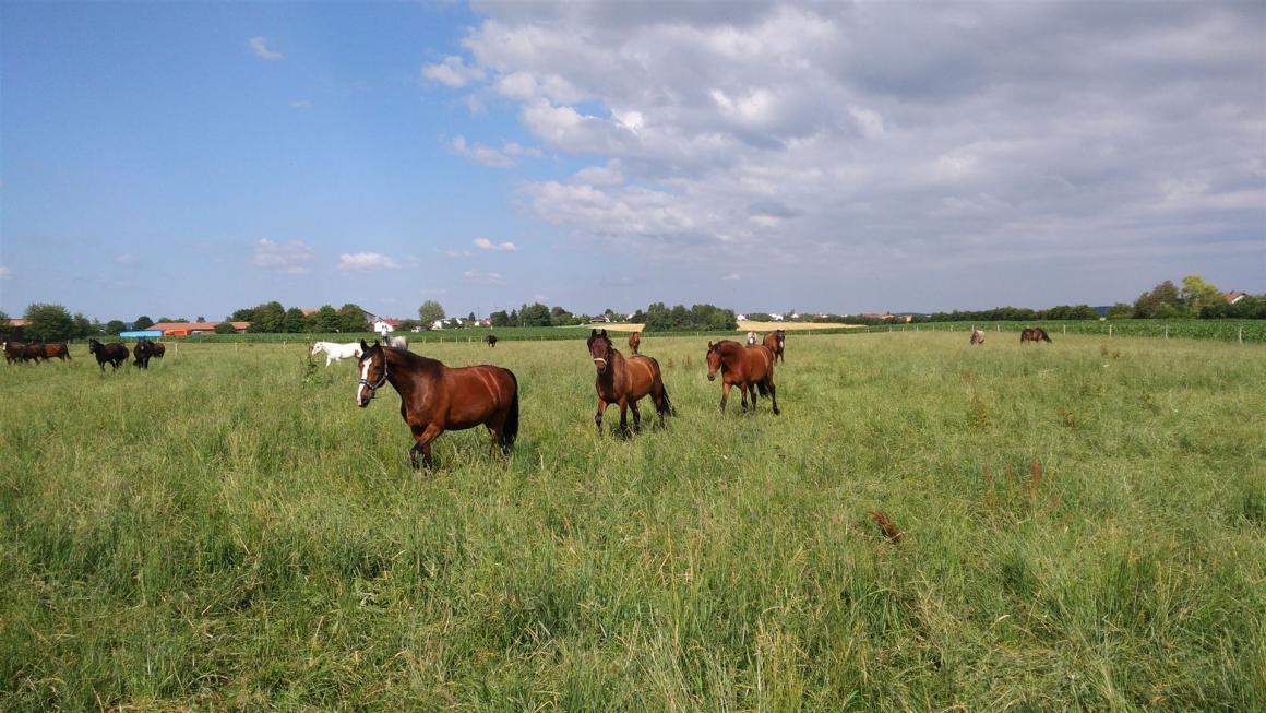 > die Pferde werden in einer Wallach- und in einer Stutenherde auf große Koppeln gelassen
